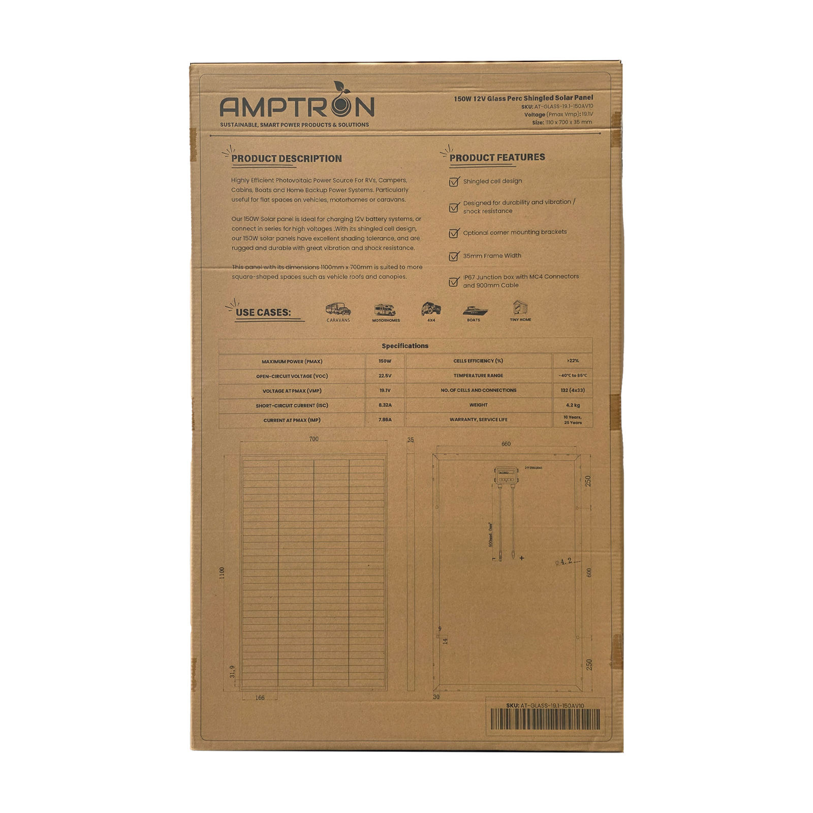 Whether you are charging a 12V battery system or building a larger array, this panel integrates seamlessly with Amptron’s ecosystem of MPPT controllers and lithium batteries to keep your adventure powered longer.